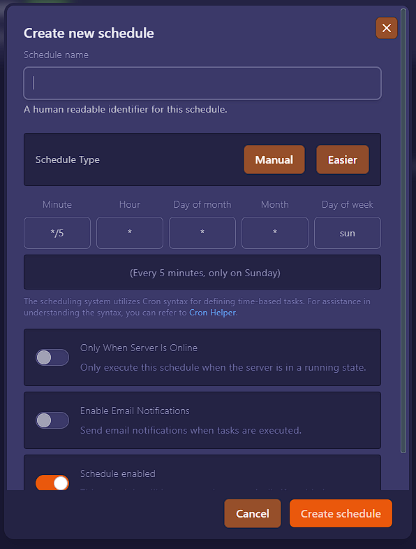3. **Configura una nueva tarea**: Haz clic en el botón \[*Create Schedule*] y completa los siguientes campos: